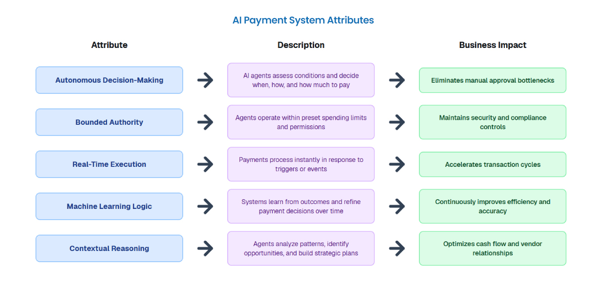 The distinction is significant. Traditional payment automation operates on fixed rules: pay this amount on this date. Agentic payments technology introduces reasoning, learning, and adaptive decision-making into the process. An AI agent might analyze inventory levels, supplier pricing, market conditions, and cash flow projections before executing a purchase order payment, adjusting terms based on real-time data – all in a goal-driven manner.